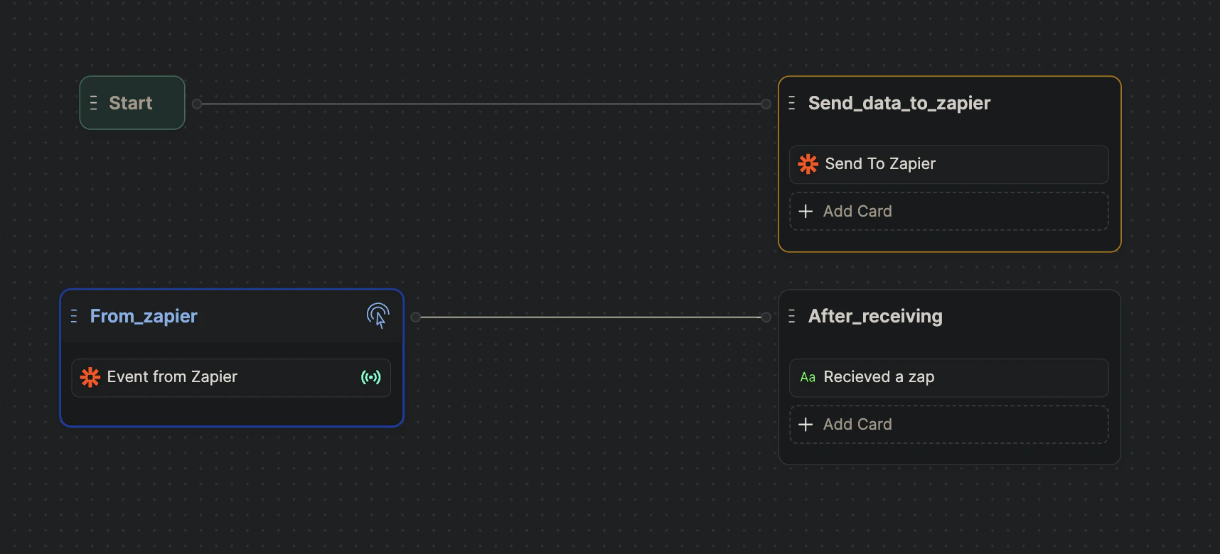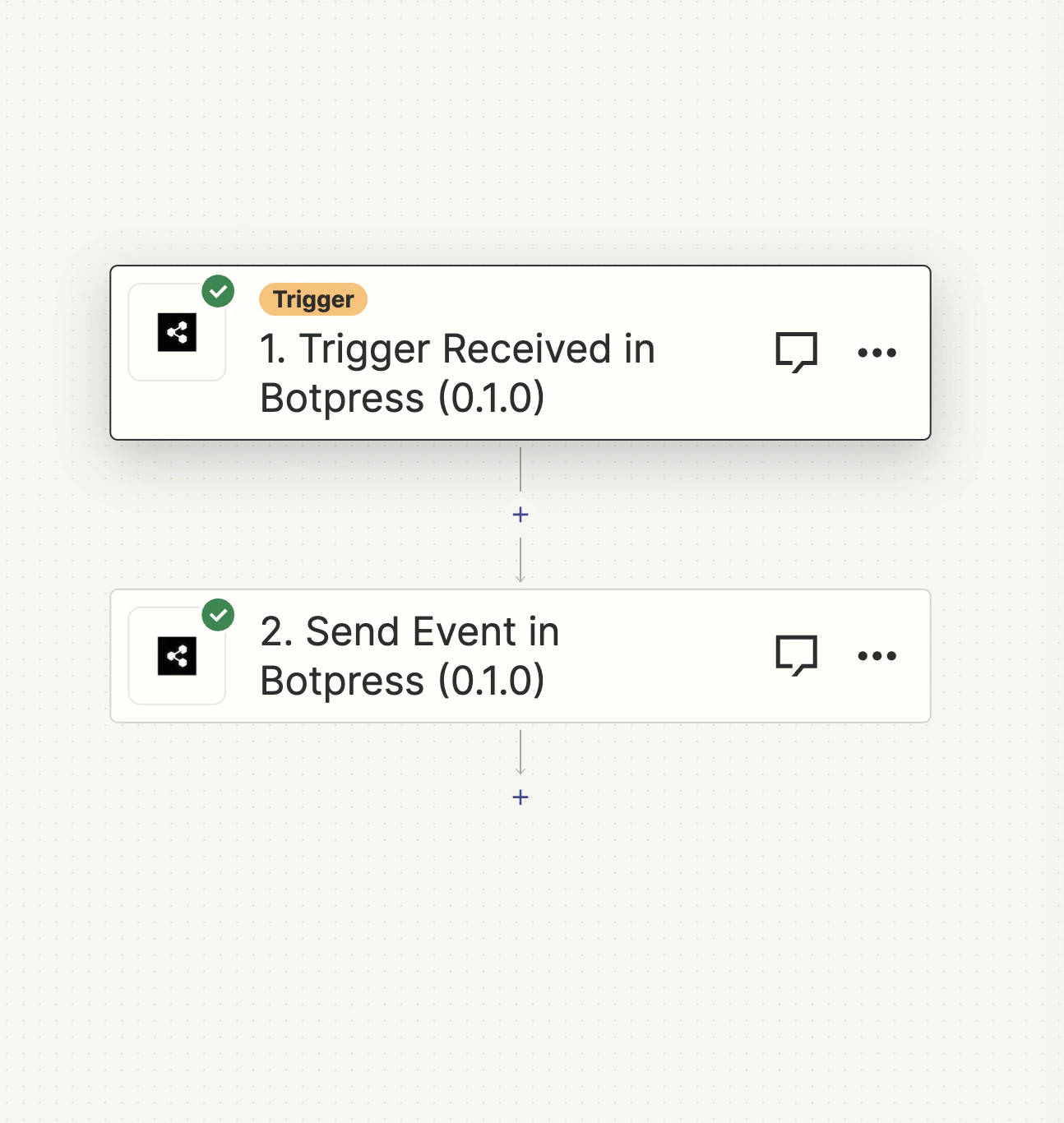 The first action receives an event from the bot, and the second one sends the same event back to the bot. You can see the events you receive on the “Discover Events” button on the node containing “Events from Zapier” card.